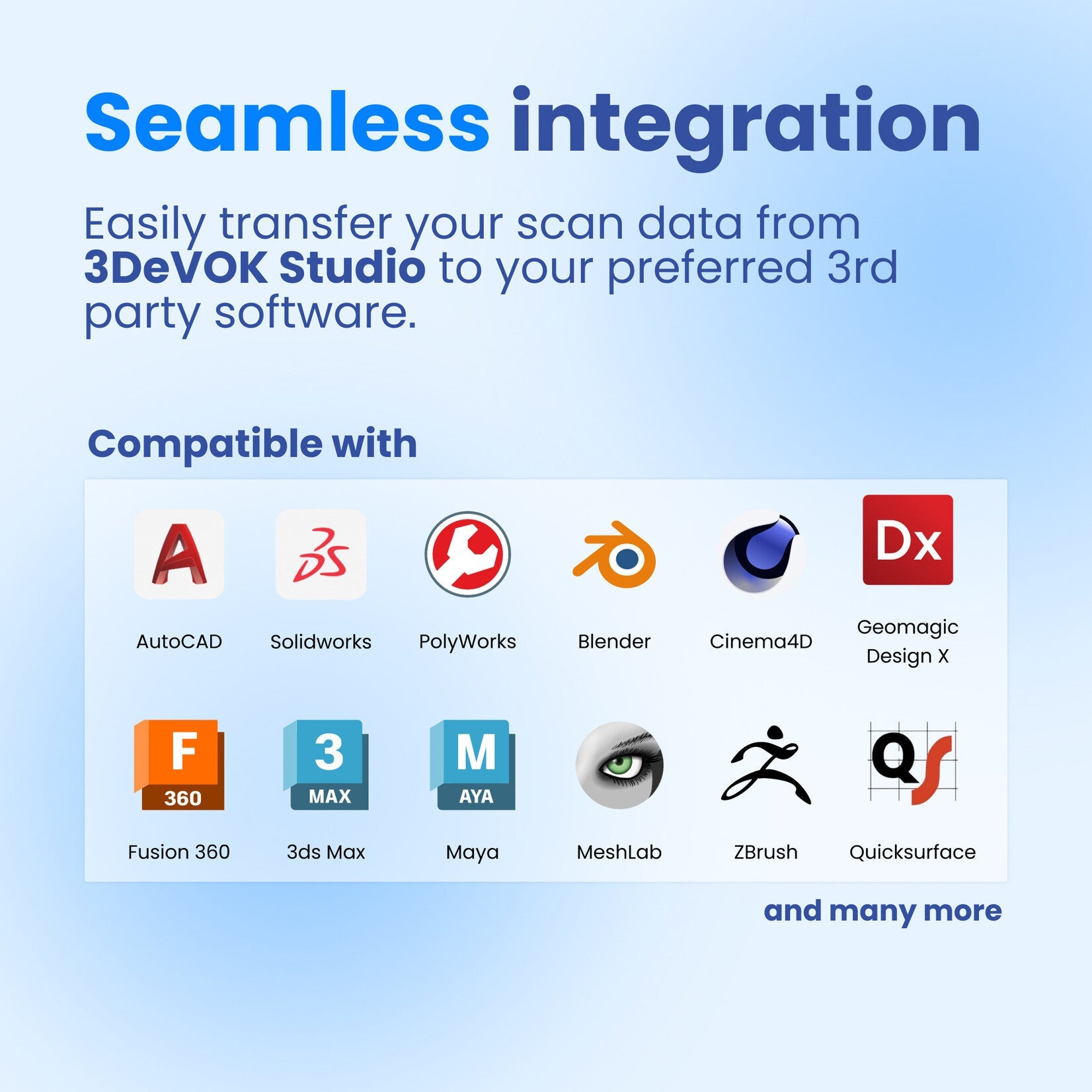 The 3DeVOK MQ scanner comes bundled with 3DeVOK Studio, our professional-grade 3D scanning software. The software includes real-time point cloud generation, hybrid alignment (texture and geometry), localized high-resolution scanning, and more. No subscriptions, no extra licenses, everything is included. After capturing the 3D scan data in 3DeVOK Studio, you can easily transfer it to your preferred 3rd party software.