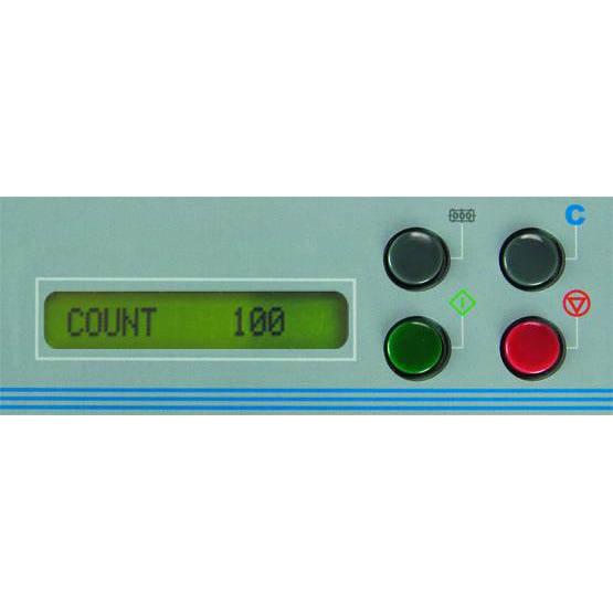 The LCD control panel includes a resettable 3-digit counter, and AutoBatch for processing a set number of sheets with a pause between sets. The built-in output conveyor features adjustable stacker wheels for neat, sequential stacking of folded pieces.