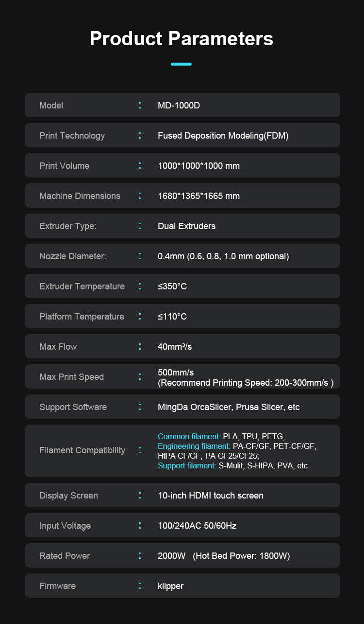 The Mingda D1000 Industrial 3D Printer is your ultimate solution for extra-large format printing without compromising speed or precision. With a 1000×1000×1000mm build volume, CoreXY motion system, and dual extrusion capabilities, the D1000 empowers professionals in manufacturing, aerospace, automotive, and education to bring big ideas to life—literally.
